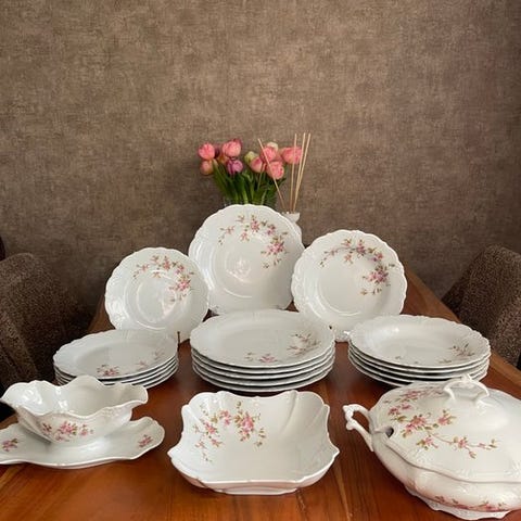 Smukt og velholdt porcelænsservice i det populære 'Æbleblomst'-design fra den anerkendte tyske producent P.T. Bavaria Tirschenreuth. Perfekt til festlige lejligheder eller som en elegant tilføjelse til samlingen.