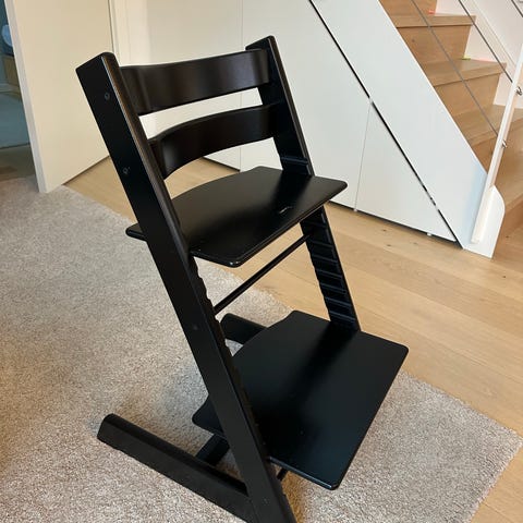 Stokke højstol i sort træ. Højstolen er designet til børn og har justerbar sæde- og fodplade for ergonomisk støtte. Materialet er træ, og stolen har en robust konstruktion med en sort finish.