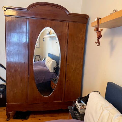 Smukt klædeskab i mahogni finer. Stort facetslebet spejl. Buede hjørner som kan åbnes bagved er der hylder og bøjlestang ( se fotos)