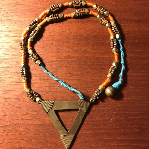 Halskæde i messing med perler og grønne detaljer.