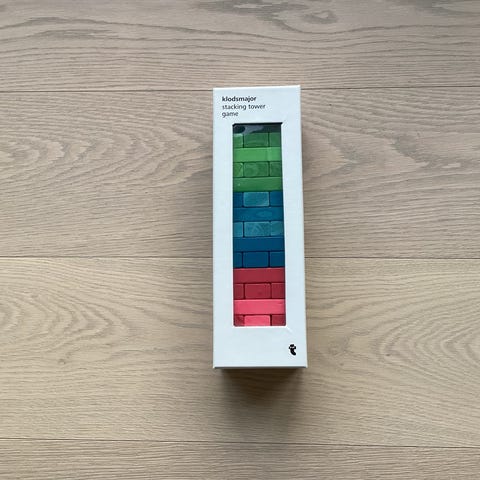 Små plastikrør man sætter ovenpå hinanden og ligger en ring og sætter rørene ovenpå igen Det er det samme som at spille klodsmajor bare med små plastic ruller hvis man har børn der er sensitive så larmer dem her nemlig ikke når de vælter