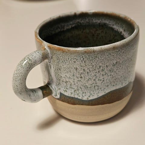 Kop fra Foged Ceramics (Knud Erik Foged). Koppen er håndlavet og unik, købt i Ribe. Højde 7,5cm, diameter ca. 6,5cm. Omkring 140 ml.