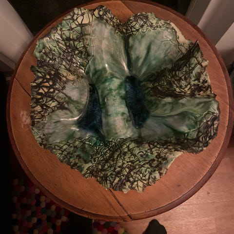 Birgit Larsen (Kratgården) Keramisk skål med blågrøn glasur og unikt design. Skålen har en organisk form med ujævne kanter og en tekstureret yderside. Diameter 19 cm. Egnet som dekorativ genstand eller til opbevaring af småting.