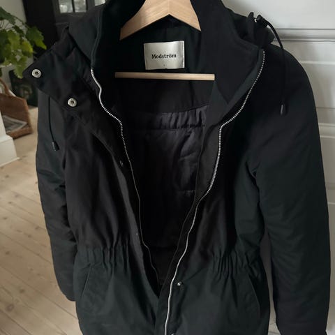 Vinter jakke i sort, brugt få gange og uden brugsspor. Materialet er dun, fjer og polyester.