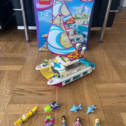 LEGO Friends Sejlads Katamaran legetøjssæt med farverige sejl, rutsjebane, figurer og tilbehør. Sættet inkluderer flere minifigurer og små elementer som delfiner og en bananbåd (se billeder).