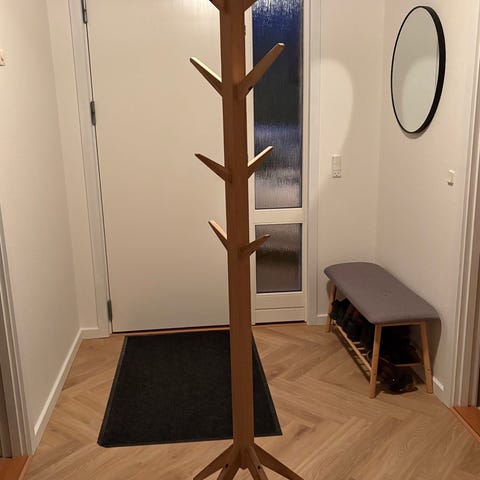 Dimensions: 40×40×174 cm. Solid pine/MDF, lacquered (black). Multiple hooks + stable round base. Good condition.