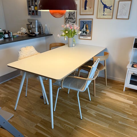 Det er os en stor fornøjelse at tilbyde dette high-end møbel fra Cane-line, hjemmehørende ved Rynkeby, Kerteminde, på Fyn. Møblet er designet af kendte Strand + Hvass Designstudio København. Velegnet til brug både indendørs- og udendørs. Bordplade i concrete grey laminat, understel udført i rustfrit stål. Elegant Semiautomatisk "en-mands" betjent udtræk. Der medfølger en tillægsplade. Længde 210/270 cm. - Bredde 100 cm. - Højde 75 cm. God plads til 12 personer. Et møbel fra allerøverste hylde. Fremstår med lette brugsspor. Butiksprisen ligger på 40 - 50.000 Kr. Kan afhentes på vores adresse i Nyborg, tæt ved motorvejen. Levering til adresse er også mulig, mod betaling. Kontakt mig gerne på mobil 29990387 for nærmere.