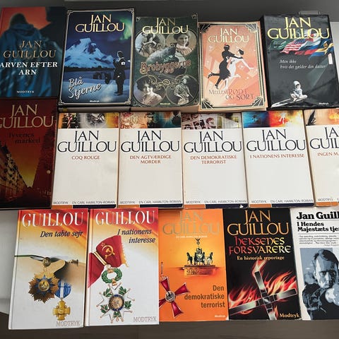 Jan Guillou bøger inklusive titlerne 1968, Den Anden Dødsbund og Englen Vender Tilbage. Forskellige udgaver med varierende omslagsdesign, tekst på dansk.
