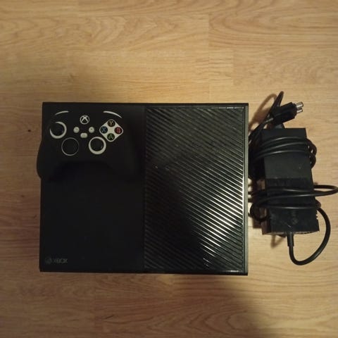 Xbox One konsol med tre trådløse controllere i sort, blå og rød farve. Inkluderer seks spil til Xbox One platformen: blandt andet FIFA 21, NBA 2K21, og Overcooked 2. Konsollen og tilbehør er egnet til gaming på Xbox One systemet.