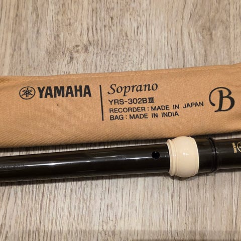 Yamaha sopranblokfløjte i lys træfarve med etui i brun og grøn. Instrumentet består af to dele og leveres med etui til opbevaring og transport.
