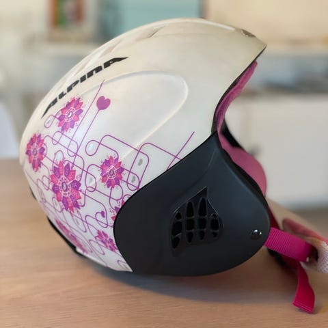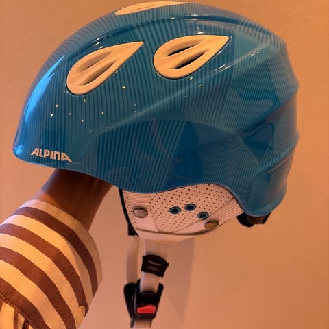 Alpina skihjelm i blå farve med grønne detaljer. Hjelmen er fuldstændig som ny, kun brugt to gange.