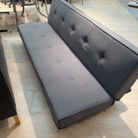 Rød sofa med sorte mønster. Sofaen kan anvendes som både siddeplads og soveplads.