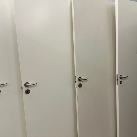 Indvendig dør i hvid med rustfrit stål håndtag og nøglehul. Døren er egnet til brug i boliger eller kontorer, hvor en enkel og funktionel dør er nødvendig.