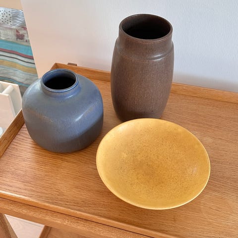 Saxbo lampe i sandfarvet. Den har et hak i bunden, som man ikke kan se, når den står op samt små brugsstriber. Selve glasuren er intakt og ingen hakker eller revner i synlig kugledel. Den virker fint.