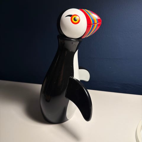 Kay Bojesen Puffin figur lavet i træ. Figuren forestiller en lunde (puffin) med sort, hvid og farvet bemaling på næbbet. Designet er karakteristisk for Kay Bojesens ikoniske træfigurer.