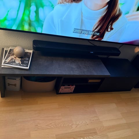 IKEA TV-bænk i grå farve med flere opbevaringsrum. Møblet har et enkelt og funktionelt design med ben i metal. Velegnet til opbevaring af elektronik og medieudstyr.