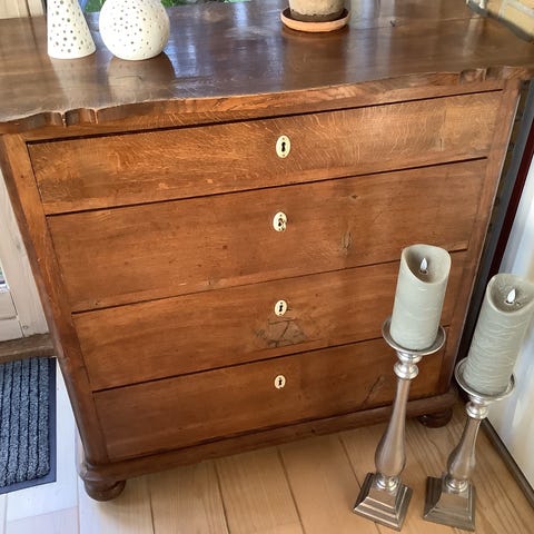 Der er slået en flig af på toppladen som er nem at få malet over. Se sidste billede.