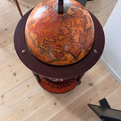 Vintage globusbar i træ med malet dekoration på indersiden. Globussen kan åbnes og indeholder rum til opbevaring af flasker og glas. Baren har en rund form og står på tre ben. Den ydre overflade viser tegn på brug og ælde med afskalninger i malingen.