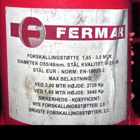 Fermar Forskalingsstøtte med en justerbar længde fra 1,4 til 1,9 meter. Fremstillet i rød farve. Anvendes til understøttelse ved forskaling i byggeprojekter. Produktet er lavet af metal og har en belastningskapacitet på op til 1500 kg.