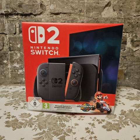Nintendo Switch 2 Konsol med standard joycon. Konsollen har en bærbar og stationær spilfunktion, der gør det muligt at spille både hjemme og på farten. Mario Kart 2 versionen. Kan også sendes.