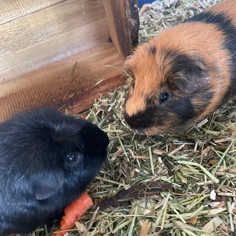 To tamme marsvin ca. 5 år gamle. Gnaverbur med mulighed for to etager. Måler ca 100x50cm Alt på billedet følger med. Afhentes i Ørestaden i Kbh.