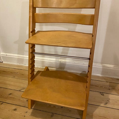 Stokke højstol i mørkt egetræ med justerbare trin og ryglæn. Designet til børn og giver støtte under måltider og aktiviteter. Stolen er nypudset og olieret. Den fremstår næsten som ny og kan holde mange år endnu.
