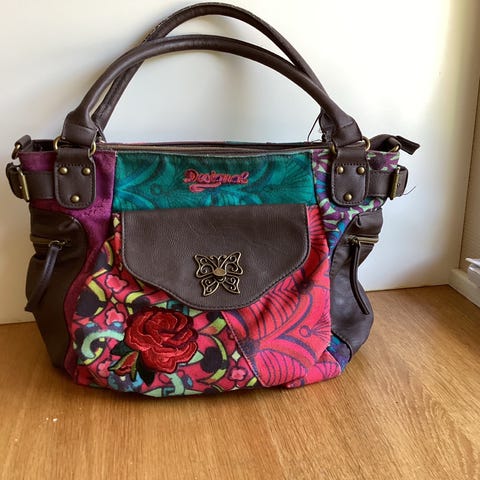 Desigual stof taske til kvinde med flere lommer og justerbare stropper. Tasken har et farverigt mønster med forskellige nuancer af rød, sort og beige, og er designet til hverdagsbrug.