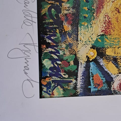 Charlotte Thymark Gyldne kunsttryk med blå og guld farver. Indrammet kunsttryk med signatur af Charlotte Thymark. Motiv med dekorative mønstre og arkitektoniske elementer i en rektangulær ramme.
