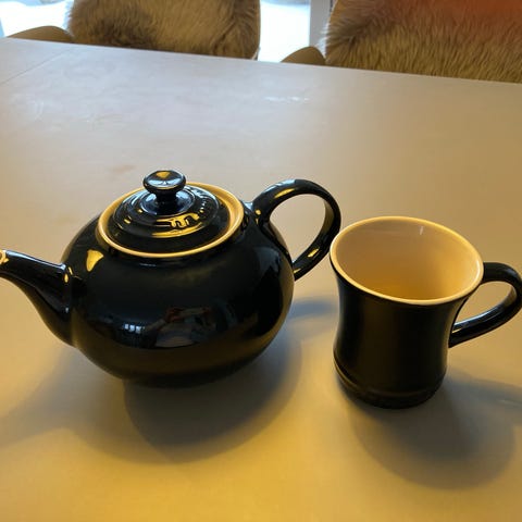 Le Creuset tekande i rød emalje. Tekanden har en lille skade på snuden som ses på det ene billede