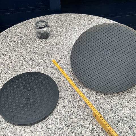 Balancetræningsplade med rund træbase og sort plastikoverflade med riller. Designet til balanceøvelser og styrketræning.