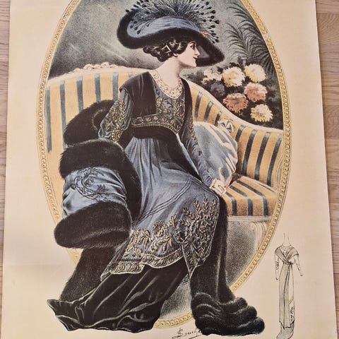 Le Petit Echo de la Mode vintage modeblad med illustrationer af kvinder i tidstypisk tøj. Bladet indeholder modeinformation og stilarter fra en tidligere periode og kan være af interesse for samlere eller til historisk reference. 35x26 cm