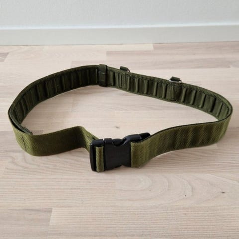 Militær bælte med sort læderrem og messing spænde med anker og stjerne motiv. Bæltet er justerbart og 110 cm langt