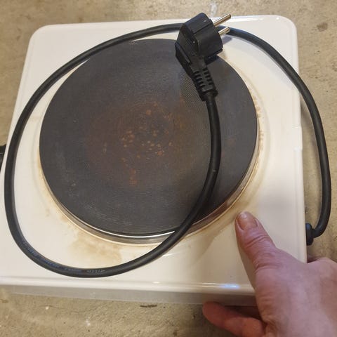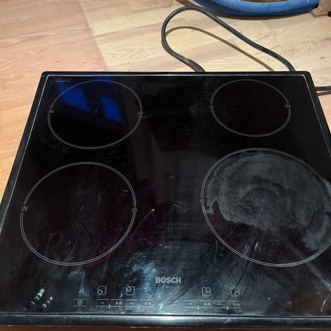 Bortforæres. Har synlige brugsspor. Desuden skråner den store kogeplade lidt mod midten. Men de virker.