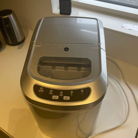 Salling ismaskine i rustfrit stål med låg og gennemsigtigt vindue. Designet til at lave isterninger derhjemme med nem adgang til isbeholderen. Kompakt størrelse med elektrisk tilslutning.