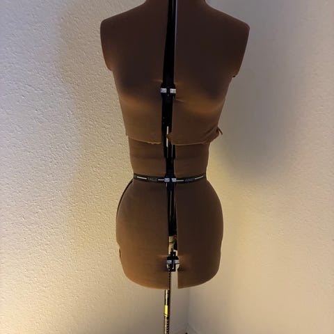 Syerske mannequin med sort stofbetræk og justerbar træfod. Bruges til tilpasning og fremstilling af tøj. Passer til forskellige beklædningsprojekter og designformål.