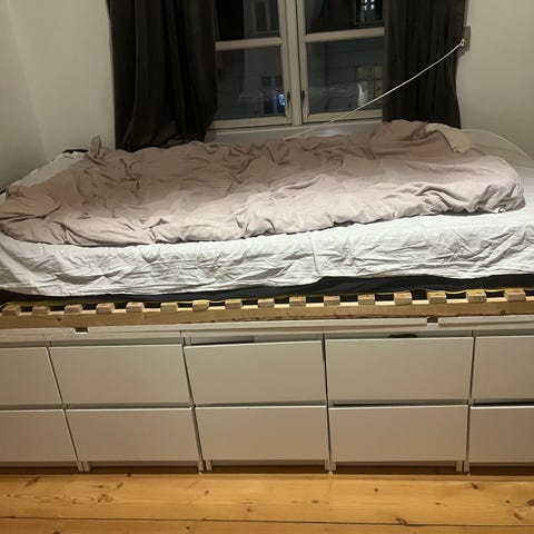 Rigtig fin højseng med skuffer og reol under, gives væk gratis. Hurtig afhentning prioriteres. Den skal afhentes i morgen d4/1. Den bliver skilt ad inden afhentning