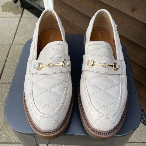 loafers i størrelse 36. Skoene er i beige lakmateriale og har en dekorativ gulddetalje på forsiden. Designet til kvinder.