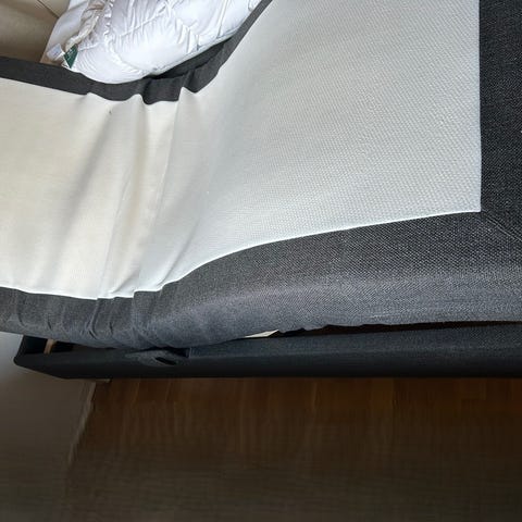 To velholdte elevationssenge med madras og topmadras i lakeret bøg.