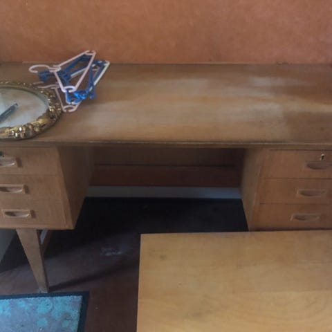 Gammelt skrivebord I massivt egetræ med tilhørende stol.