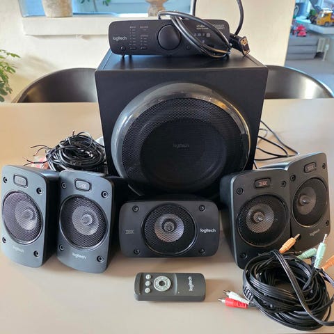 komplet Logitech Z906 5.1 surround system med subwoofer, 5 satellithøjttalere og kontrolenhed.
