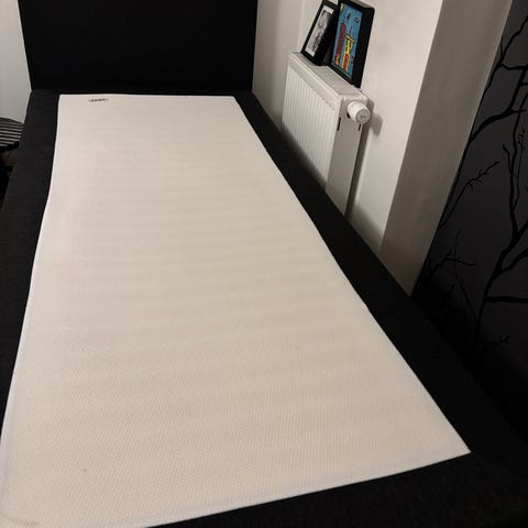 Der kan følge en topmadras til, den er helt pletfri på den ene side, men den anden side er ikke så pæn mere selvom der altid er brugt lagen.