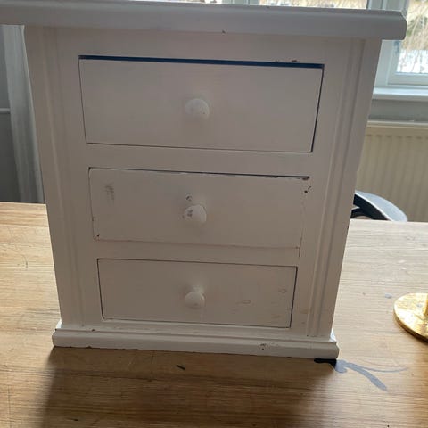 Unika møbel // Lille fint vintage skuffedarium med skuffer af porcelæn. Selve møblet er rundt og lavet af bemalet bøgetræ. H: 21 cm Ø: ca 17 cm ved top og bund, så nemt at finde plads til og fint og anvendeligt mange steder i boligen. Få brugsspor ifa lidt afskalning af maling. Kan ses på billedet. Kr 595,-