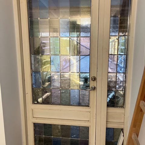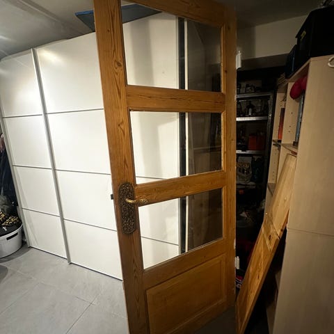 Indbygget trædør med glaspartier, bestående af en dør med to tilstødende faste glaspartier. Glaspartierne er med mønstret, matteret glas, der sikrer lysindfald samtidig med privatliv. Døren og glaspartierne har trærammer og passer til indvendige rumadskillelser.