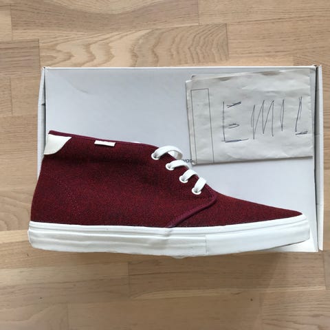 Premium red suede with breathable mesh, gold detailing, STI Energy Foam for comfort, and grippy gum double-cup sole. Deadstock with original box—reviving ’90s skate heritage for performance or collection at 700 DKK.