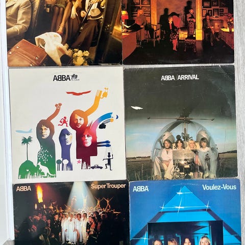 Samling af vinylplader fra ABBA med forskellige albumcovers. Indeholder flere klassiske album i originaludgave. Passer til afspilning på standard vinylpladespillere.