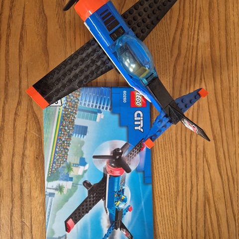 LEGO City flyvemaskine med blå, hvid og grå farver. Mange detaljer som cockpit og kabine med sæder og toilet bagerste i flyvemaskinen. Passer til LEGO City temaet. Sælges uden minifigurer.