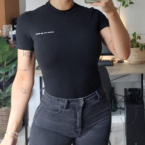 Grå tshirt med lidt høj hals og teksten "Born to be wild"