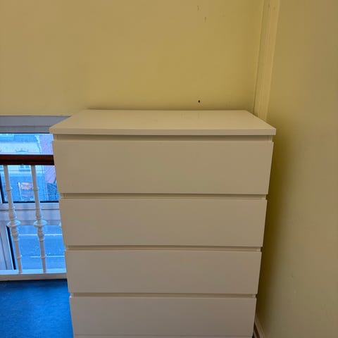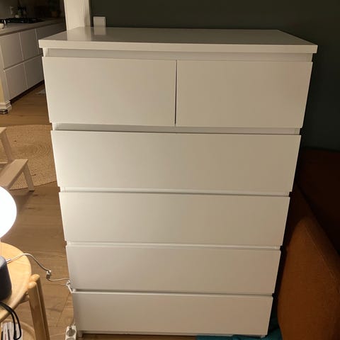 IKEA MALM Kommode i hvid. Møblet har flere skuffer til opbevaring og et enkelt, funktionelt design. https://www.ikea.com/dk/da/p/malm-kommode-6-skuffer-hvid-60403584/ Vi har købt den brugt for et par år siden og har desværre ikke plads til den længere - derfor sælger vi videre billigt her.