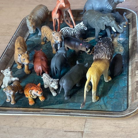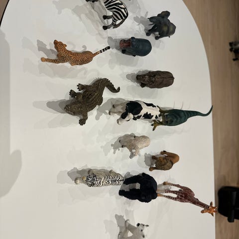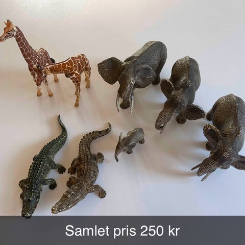 Dyrefigurer bl.a. fra Schleich. Sættet indeholder f.eks. elefanter, løver, giraffer, krokodille, zebra og andre vilde dyr.
