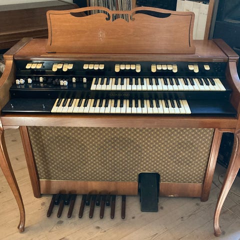 Hammond orgel fra 1970’erne. Har stået i garage i 18 år, så trænger til lidt renovering. Tangenterne virker, pedalerne giver ikke lyd og lesley’en skratter lidt, så elektronikken indvendig trænger nok til en gang rens. Byd på det…